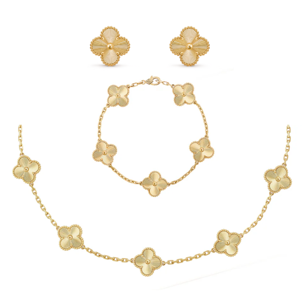 O Kit Trevo Virginia traz a elegância atemporal dos trevos em um conjunto completo de acessórios em Aço Inoxidável 316L com Banho de Ouro 18K, perfeito para valorizar seu dia a dia ou para presentear alguém especial.